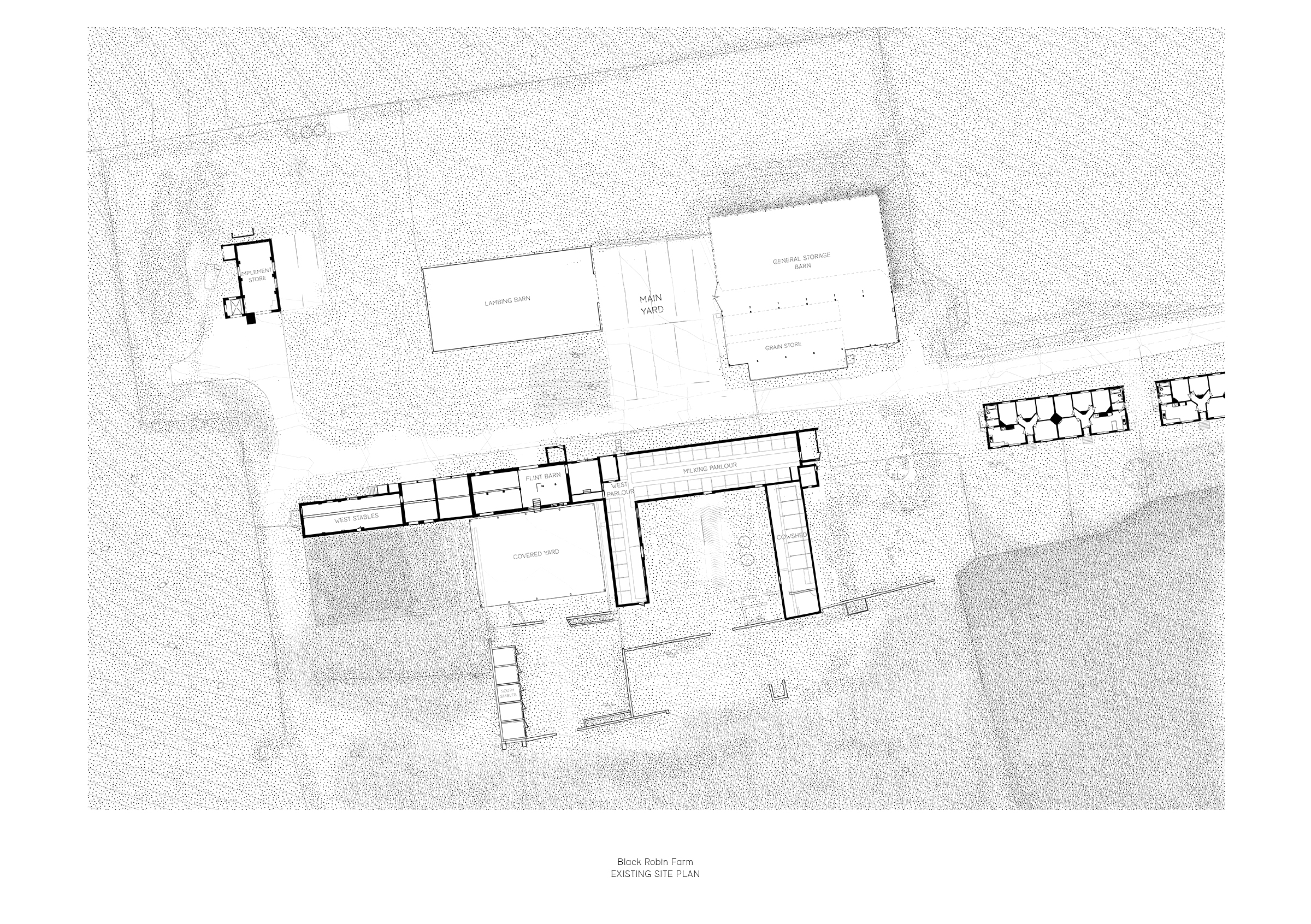 The farm and its site is shaped by the mineral landscape of chalk and flint. The pale, dry, porous terrain comprises flint-spattered fields, hedgerows, and shallow valleys, to which the architecture responds directly. Material re-use has been prioritised, with reclaimed brick, lime mortar, flint, and landscape excavations forming a palette born of the site. Recycled knapped flint from deconstructed walls and buildings, along with natural field flints foraged on site, will be incorporated, and any existing lime mortar will be reused as aggregate. Working with The Flint Wall Company, a local specialist, we have developed a robust approach to materials, finishes, and construction rooted in the character of the site.