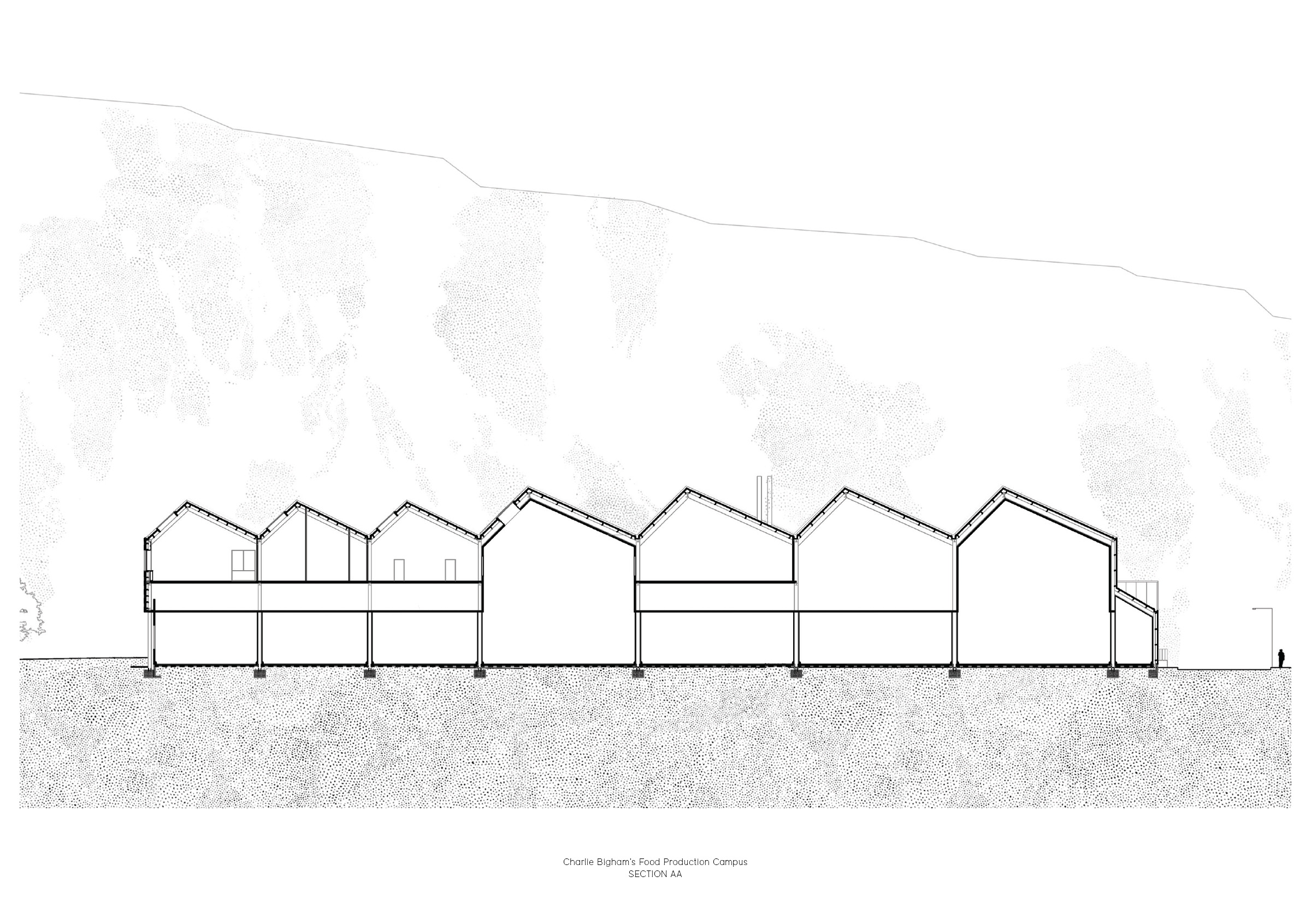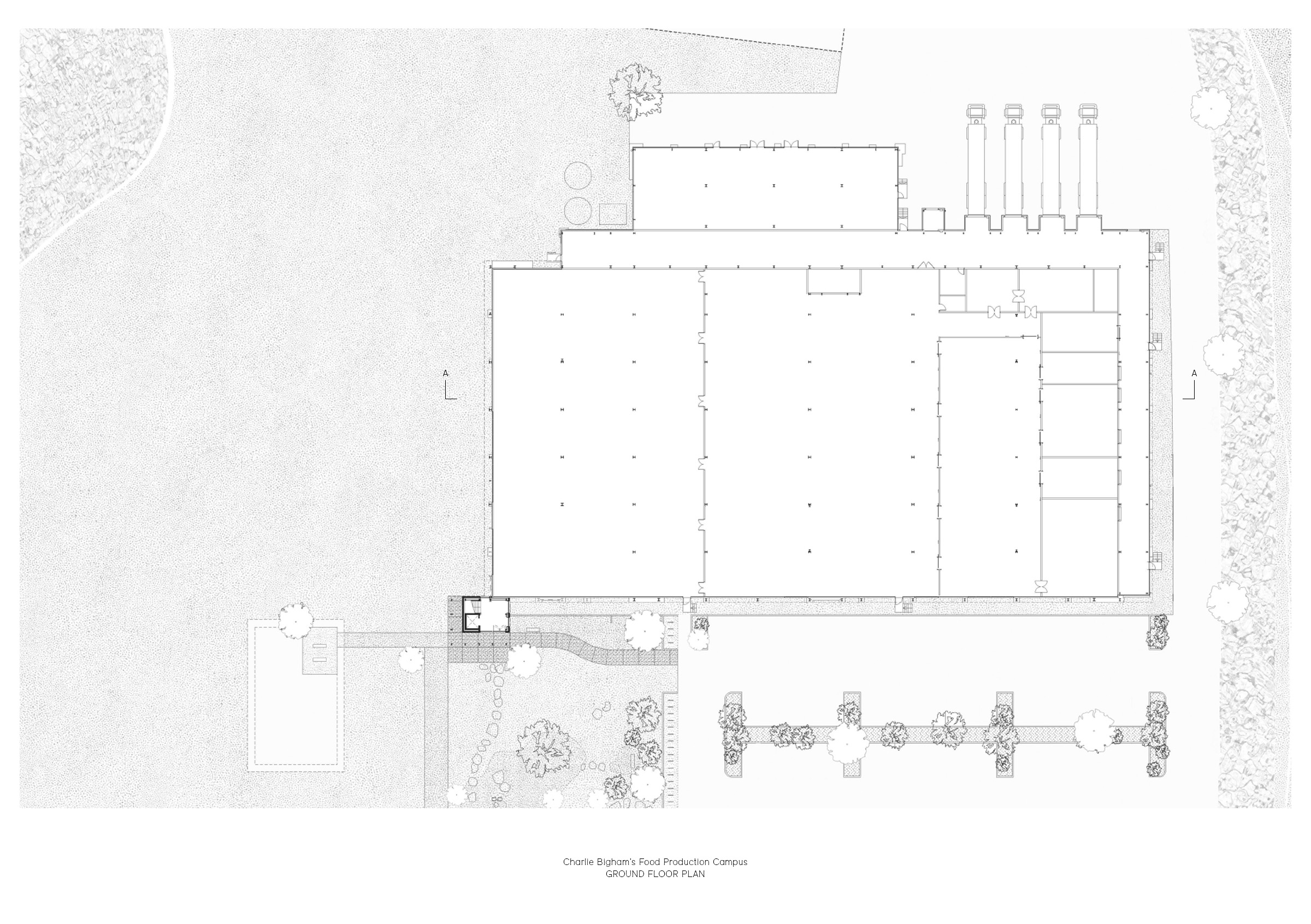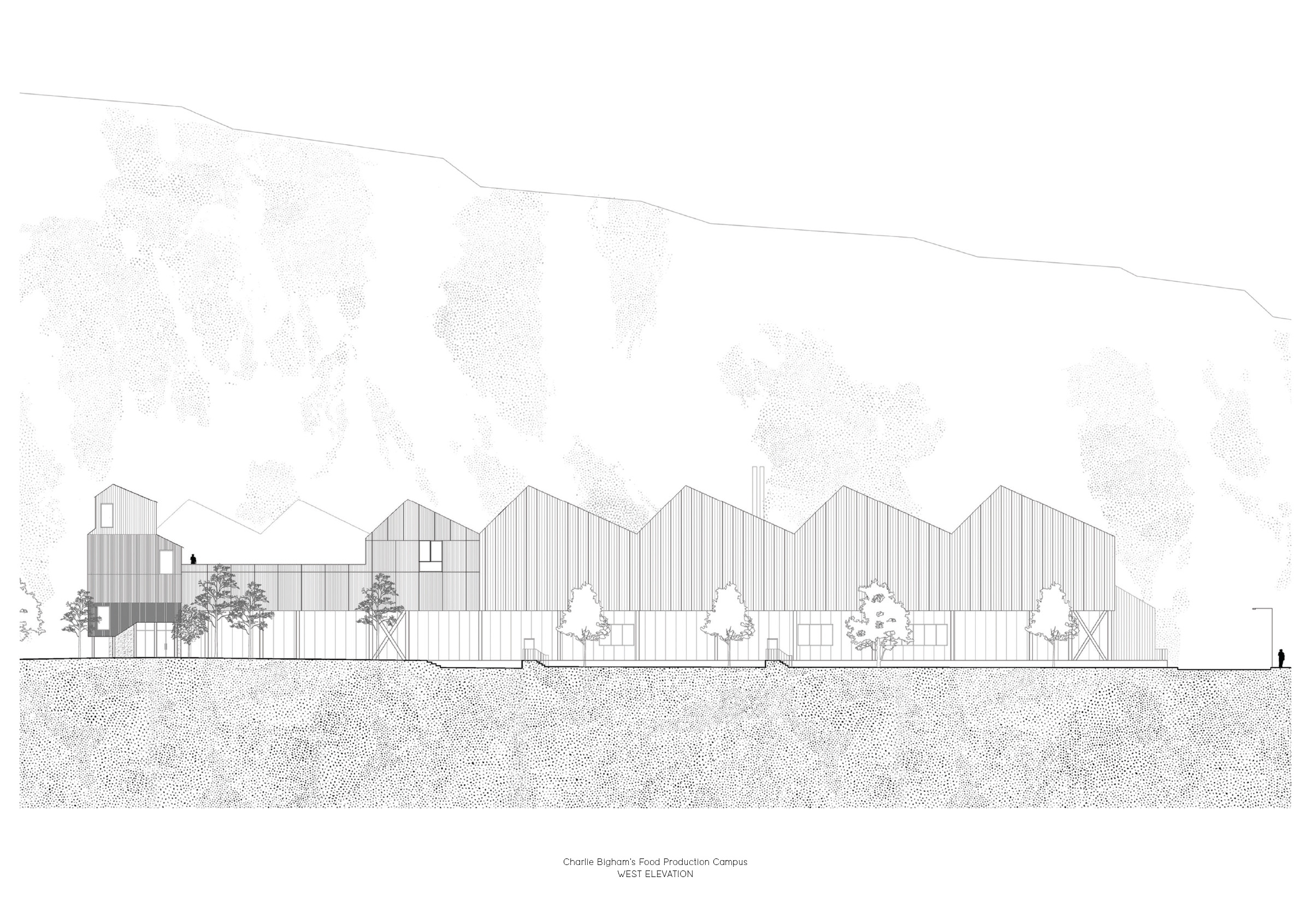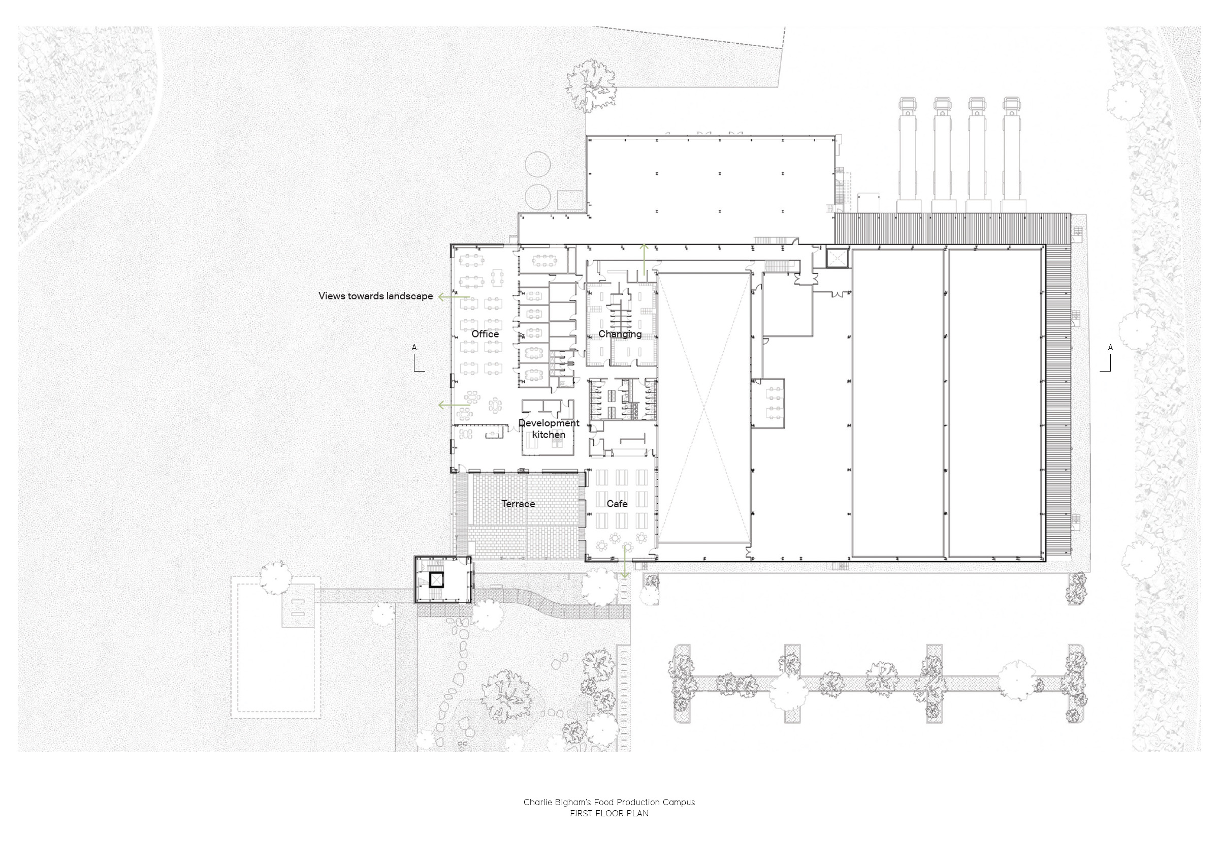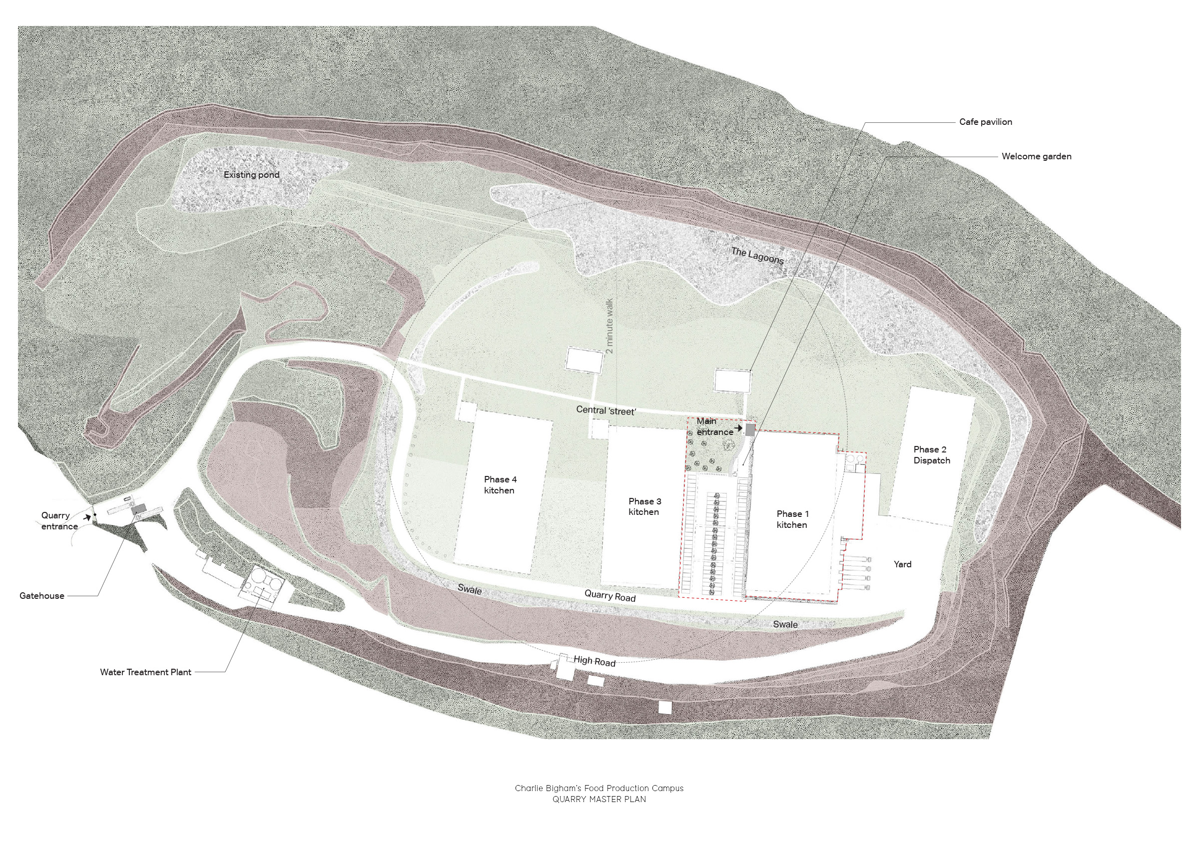 With the firm belief that the highest quality food can only be produced in a high quality working environment, renowned food production company, Charlie Bigham’s, set about this aspiration to create an outstanding workplace in the unique landscape of Dulcote Quarry, Somerset. The project will be their long term home, and makes spatial provision for the business to grow organically. A masterplan revitalises the natural landscape and ecology by siting future kitchens and infrastructure along the southern edge, allowing the north to flourish; and proposes a thriving campus of food production and communal pavilions for employees.
