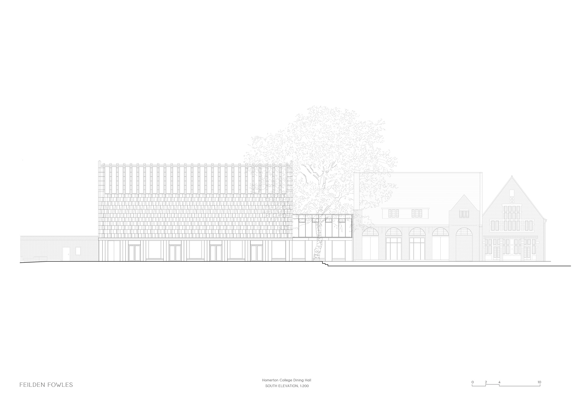 Homerton College is located in the south of Cambridge, although its first premises, acquired in 1768, were near Hackney Marshes in London. Founded as a nonconformist academy by dissenting Protestant thinkers, the College has retained a free-thinking spirit, reflected in its notable alumni. The design of the dining hall embraces this ethos by championing a new architectural language that is sympathetic to its context while introducing a new material and formal vocabulary. The core buildings on the current site were constructed in the 1870s for Cavendish College, with Homerton relocating there in 1894. The College became a full member of the University in 2010 and now offers all subjects, with the largest student body in Cambridge.