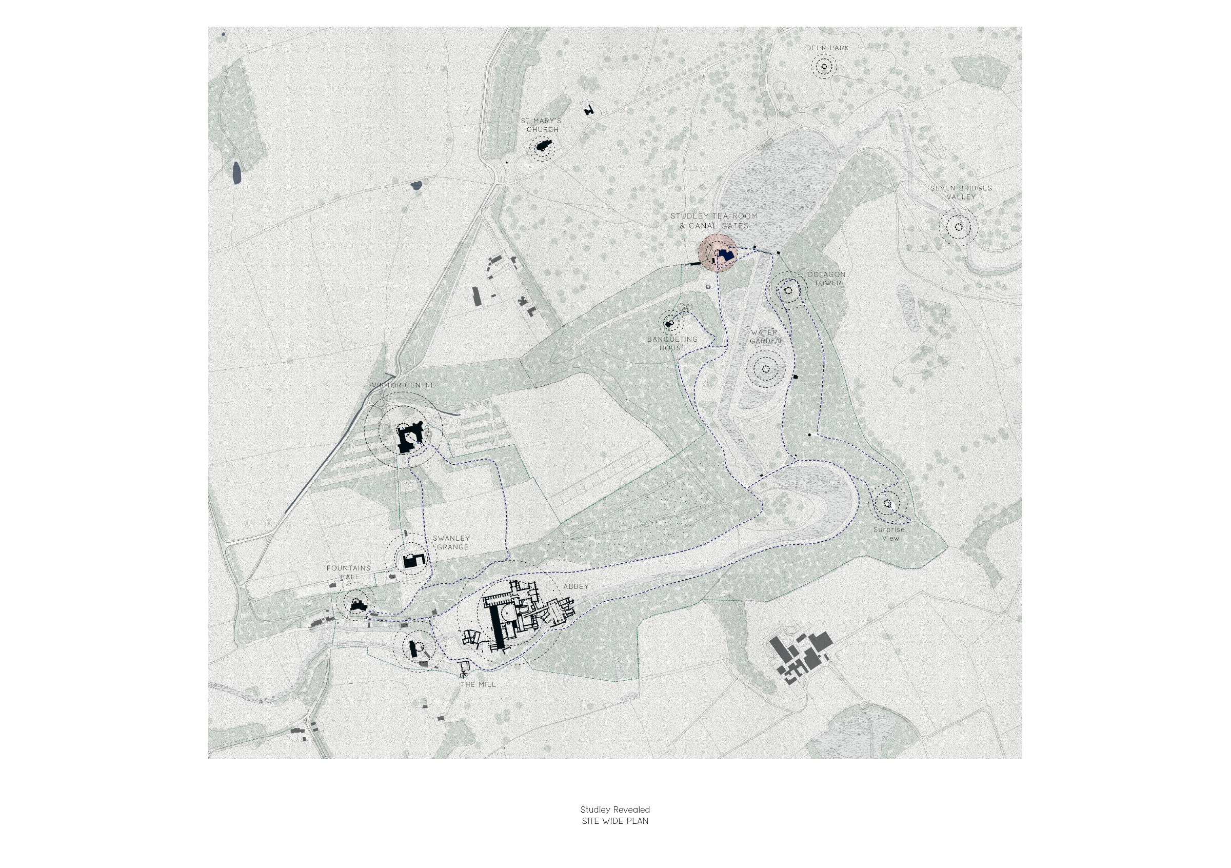 The Canal Gates once formed the formal arrival to John and William Aislabie’s Georgian water garden, part of today’s UNESCO World Heritage Site of Fountains Abbey & Studley Royal and the Nidderdale AONB. Beyond lies the deer park with red, fallow and sika deer and ancient groves of lime, oak and chestnut. The water garden itself orchestrates long, borrowed views to the abbey and Surprise View. Over time, arrivals shifted to the rear Visitor Centre, leaving the Gates diminished in meaning. The project restores this threshold, reuniting the deer park and garden, and reinstating the Georgian sequence at its true entrance.