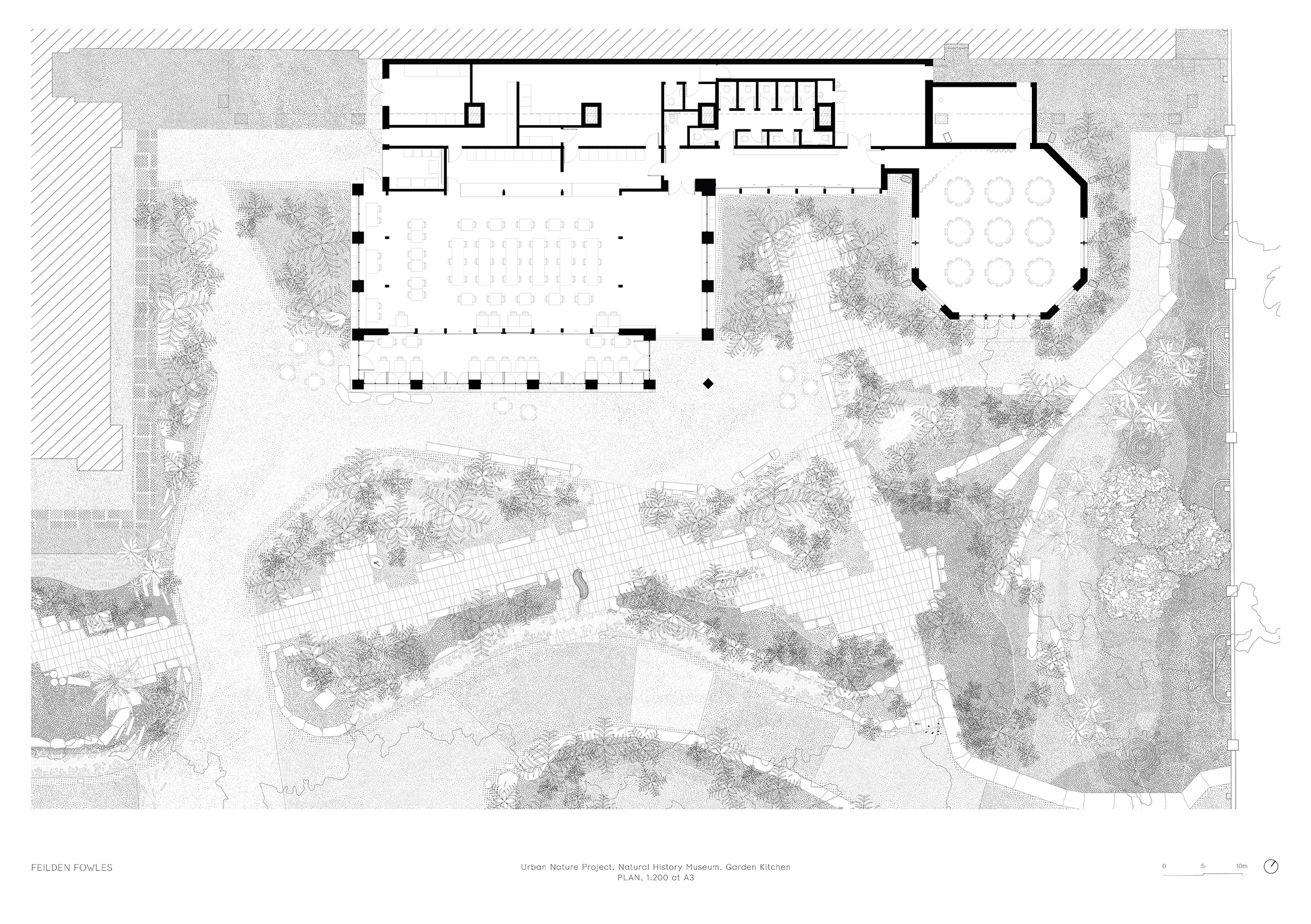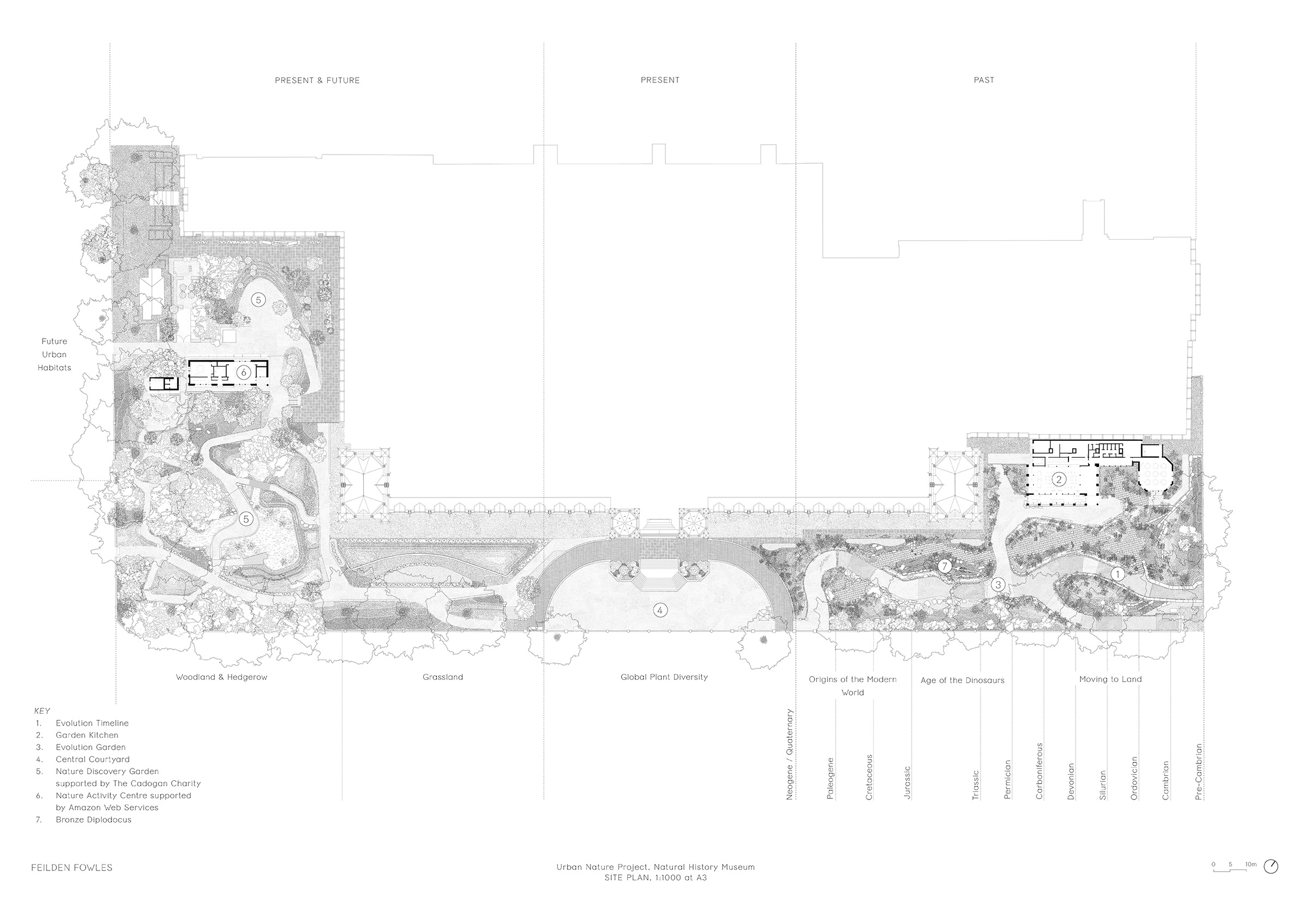Feilden Fowles collaborated with the Natural History Museum and J&L Gibbons on the Urban Nature Project, the museum’s response to the pressures of urbanisation and biodiversity loss. The project transforms underused outdoor spaces into a biodiverse public garden that also acts as a living laboratory where scientists can monitor and study urban wildlife. Beyond its scientific mission, it aims to inspire people across the UK, regardless of background or location, to help safeguard nature in towns and cities. The scheme includes a three-dimensional Evolution Timeline Wall, the Evolution Garden, Garden Kitchen, Nature Activity Centre, and internal refurbishment to several existing museum spaces.